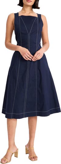 Contrast stitches highlight this square-neck midi dress cut from crisp poplin in a charming A-line silhouette.