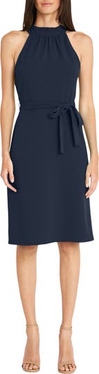 Go from desk to dinner in this solid sheath dress fashioned with a ruffled mock halter neck, removable waist tie and hidden side pockets.
