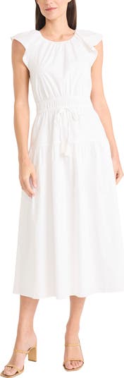 Effortlessly elegant, this tiered midi dress features a figure-skimming smocked waist and is finished with fluttery sleeves.