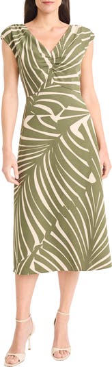A bold pattern draws the eye to this woven midi dress framed by cap sleeves and fronted with subtle ruching off the neckline.