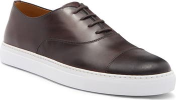 A sporty white sole and cushioned, removable insole give traction and support to this versatile cap-toe sneaker rendered in smooth burnished leather.