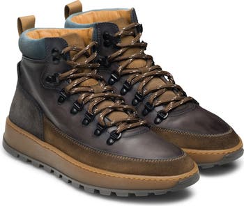 A toothy lug sole inspired by traditional hiking attire brings a rugged aesthetic to this water-repellent boot featuring mixed-texture layers of leather and suede.