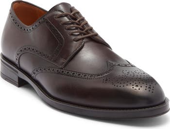 A brogue-trimmed wingtip toe adds timeless sophistication to a cushioned derby crafted from supple leather.