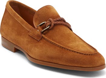 A braided rope-style strap is artfully knotted to the vamp of this streamlined loafer made from rich, supple suede.