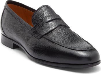 Exude polished style in this pebbled-leather penny loafer framed by a classic apron toe and low block heel.