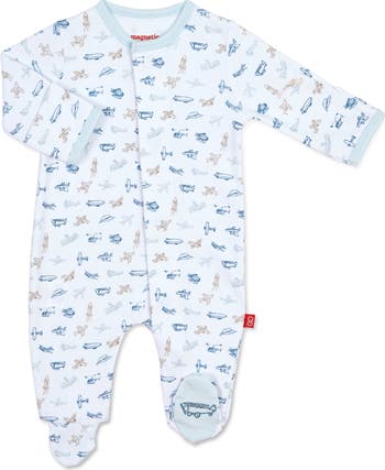 All kinds of aircraft fly willy-nilly on the blue sky of a comfy organic-cotton footie that closes with magnets for fuss-free changes.