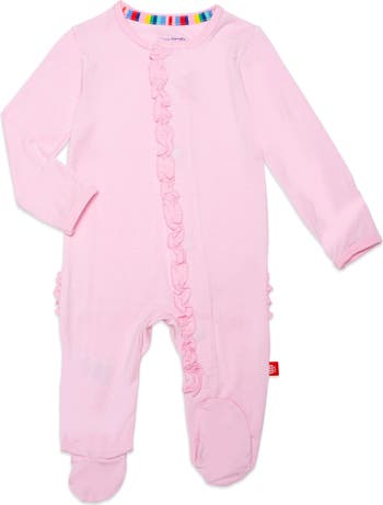 Mini ruffles sweeten this soft modal-blend footie featuring fold-over cuffs and a signature magnetic closure for easy changes.