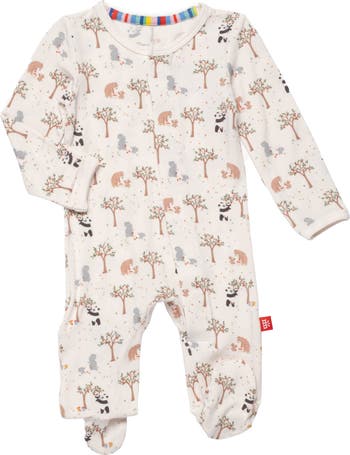 A whimsical animal print patterns a stretchy modal footie that has magnets instead of snaps or zippers for fuss-free dressing.