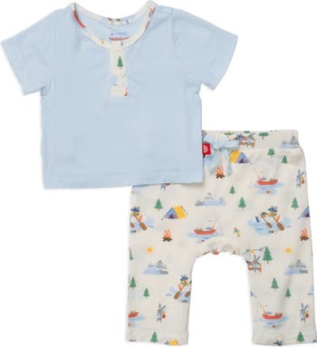 A magnetic closure off the shoulder brings ease to baby's everyday routine in this stretch-modal set of a top and coordinating pants.
