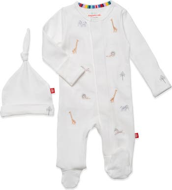 Cozy cuddles start with this matching magnetic footie and hat crafted from a breathable organic cotton in the cutest print.
