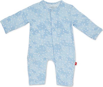 A magnetic closure makes diaper changes a breeze in this soft, stretchy romper with an adorable allover print.