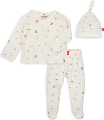 Keep your little one cozy in this soft, breathable stretch-modal set including a wrap top with a magnetic closure, pull-on pants and a coordinating hat.