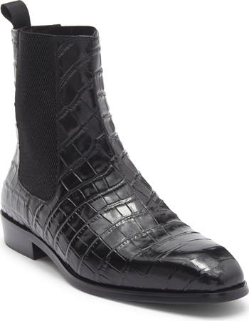 A tapered square toe and stacked heel balance a croc-embossed leather boot fashioned with a back pull-tab and side gore panels for easy entry.