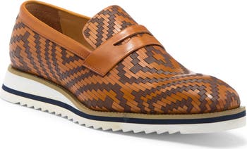 A classic penny keeper and an apron toe lend timeless sophistication to a comfort-cushioned loafer rendered in woven, two-tone leather.