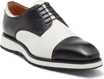 This two-tone oxford made of smooth and perforated leather with a polished cap toe is a refined workday choice.