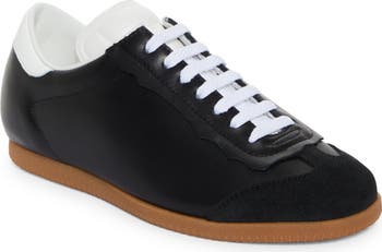 A single white basting stitch at the heel counter brands this leather sneaker crafted for lightweight comfort.