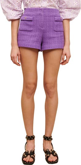Gleaming goldtone hardware lends rich detail to these posh tweed shorts with bitty flap pockets.