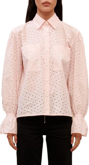 Embroidered eyelets wend a serpentine path down a voluminous cotton blouse finished with twin patch pockets and romantic, exaggerated cuffs.