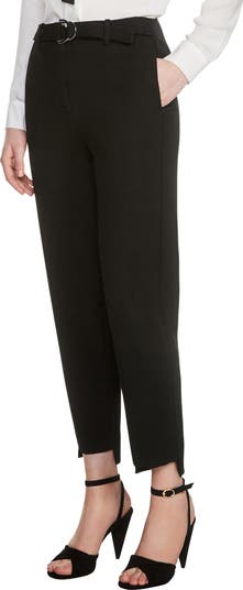 High/low hems make a chic update to pants with everyday polish tailored from a stretch fabric and belted with ties looped through a gleaming D-ring buckle.
