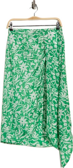 Tropical flowers bloom across this elegantly draped midi skirt cut in an asymmetric silhouette for breezy style.