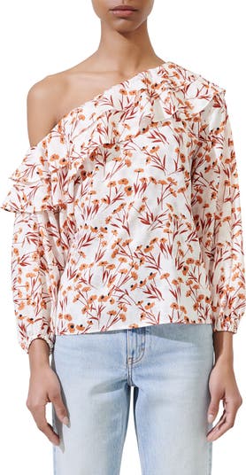 Styled to slip alluringly off one shoulder, this cotton blend top decked with ruffles and flower-powered is a charming start to lots of looks.