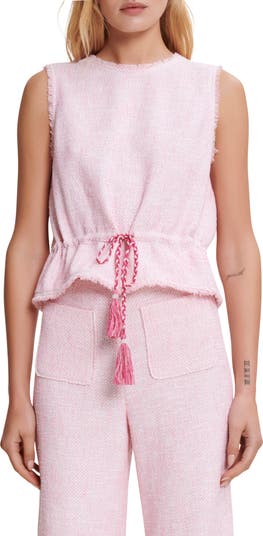Feathery fringed edges trim this sleeveless top punctuated with a flouncy peplum.