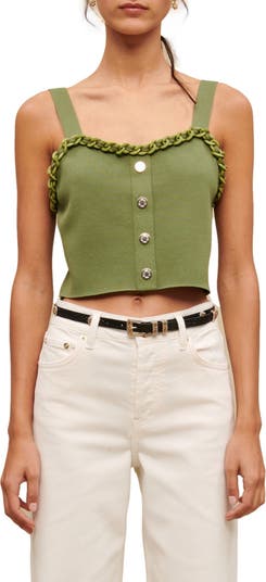 Interlaced matte chain adds an edgy element to a sweetheart-neck top boasting an abbreviated hem for on-trend appeal.