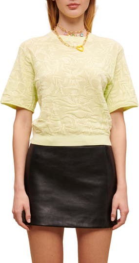 An airy open-stitch floral pattern in a citrusy hue details a short-sleeve sweater perfect for warmer days.