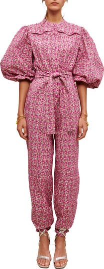 Exaggerated puff sleeves play up the fun, fanciful style of a woven cotton jumpsuit in an effervescent floral print.