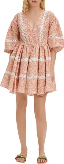 Cue up the country charm in this linen-kissed dress dappled with daisies and accented with lacy insets.
