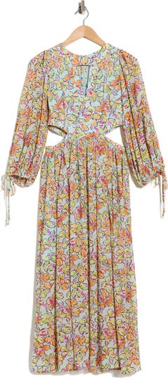 Waist-baring cutouts lend alluring detail to an ankle-grazing maxi dress covered in a vibrant pattern of blooms for eye-catching appeal.