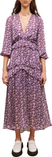 Ruffle trim adds a dimensional effect to a flowy floral-print dress featuring three-quarter sleeves and a plunge neckline.