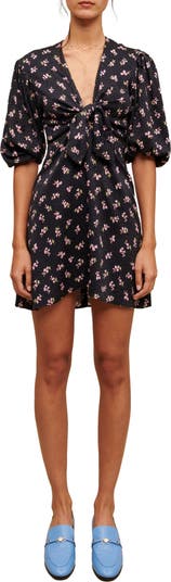 Voluminous sleeves frame a sweet minidress accented with a chic twist at the bodice and an alluring V-neckline.