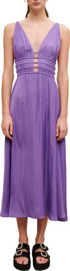 Shining goldtone beads detail the bodice of this goddess-worthy midi dress flaunting shirring on the waist and slender strap details.