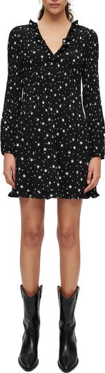 Cute, straightforward and featuring a starry pattern with a ruffed hem, this casual minidress is out of this world.