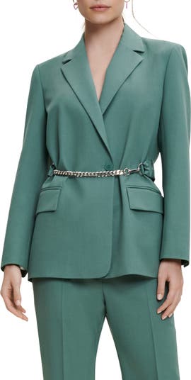 A classic blazer cut from a wool-rich fabric gets an edgy upgrade with a curb chain-link belt fastened at the waist.