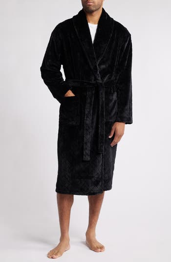 Soft, plush fleece with a subtle basket-weave texture brings distinctive comfort to a robe styled with a shawl collar and lower hem to extend the coverage.