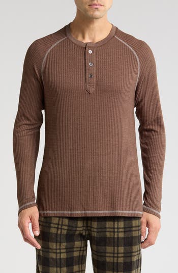 A cozy waffle texture and raglan sleeves highlighted by contrast topstitching make this lounge-ready henley perfect for treating yourself to a night in.