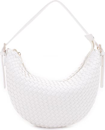 A woven faux-leather exterior brings textural intrigue to a spacious shoulder bag topped with an adjustable strap.