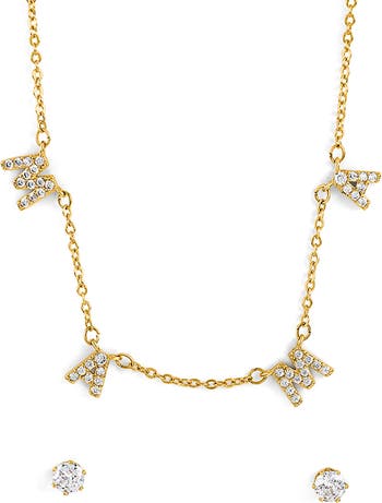 Sparkly pavé letters spell out the most precious four-letter word on this lovely necklace and coordinating cubic zirconia stud earrings set.
