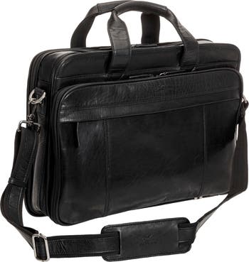 A spacious dual interior with dedicated laptop and zip pockets provide generous storage potential to an RFID-enhanced briefcase rendered in supple leather. A trolley sleeve creates easy airport navigation while traveling.