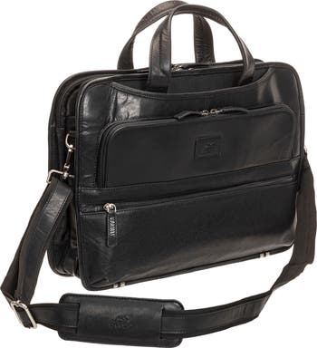 A spacious interior with dedicated laptop and zip pockets provide generous storage potential to an RFID-enhanced briefcase rendered in supple leather. A trolley sleeve creates easy airport navigation while traveling.