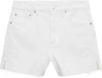 Frayed hems and side slits amplify the casually cool style of mid-rise shorts cut from lightweight cotton denim.