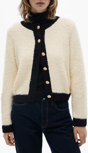 Golden crested buttons elevate this fuzzy-textured cardigan knit with bold inky trim.
