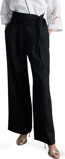 Lines of neat piping run up and down the sides of these polished linen pants fashioned with an on-trend wide-leg silhouette.