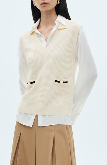 Simple contrast trim and gleaming hammered buttons at the pockets are the only interruptions to the long, sleek silhouette of this sweater vest knit from fine yarns that give this layer its light, refined weight.