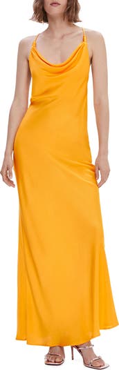 Cut from slinky satin in a blazing shade, this ankle-skimming slipdress is ready to heat things up on the party circuit.