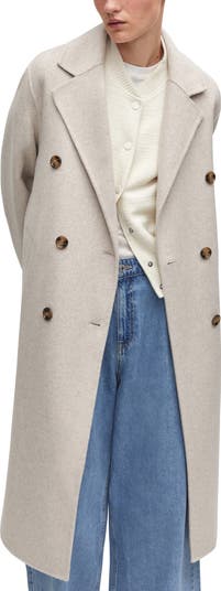 Glossy tortoiseshell-patterned buttons lend chic contrast to a double-breasted longline coat fashioned with an elongated back vent for easeful movement.