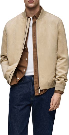 A suede-effect finish brings rich texture to this wardrobe-essential bomber jacket crafted in a solid hue for pair-with-everything versatility.