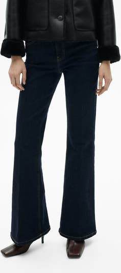 Contrast topstitching highlights the dark wash of stretch-enhanced denim jeans finished with '70s-inspired flare hems that exude retro charm.